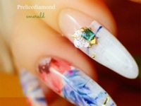 さっそくサロンでもダイヤモンドネイルを導入、お客様にも大好評!それからというものひたすら検証を重ね、ダイヤモンドを取れにくくする方法、コーティングの仕方etc....マニアックな検証の日々に明け暮れました。その姿勢が認められ、Prelice Diamondに携わりダイヤモンドの輝きを引き出すオリジナル商品「プレズィールジェル」とダイヤモンドのデザインをサポートする「ダイヤモンドラメ」を監修させて頂きました。